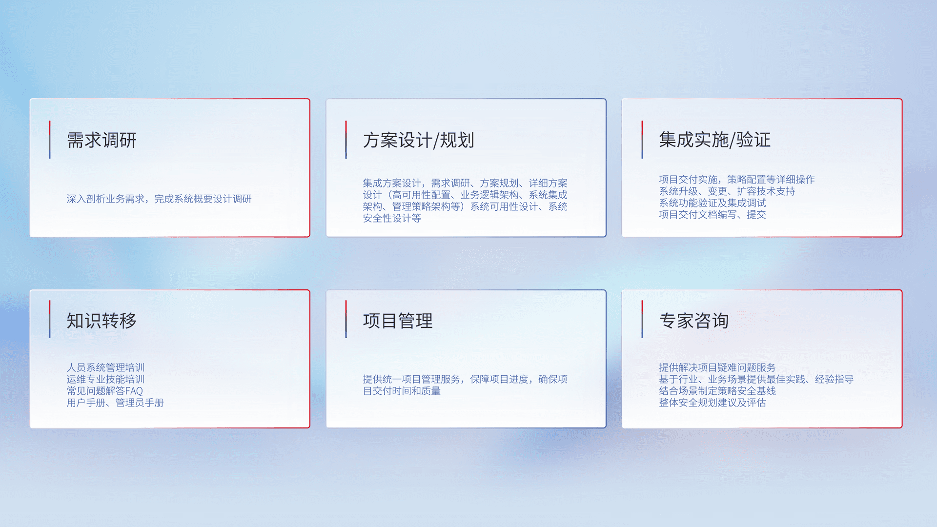 针对客户行业特性,,,将宏观的安全战略和需求,,通过专业的交付服务,,实现项目落地,,,为客户提供标准规范的集成交付服务。。